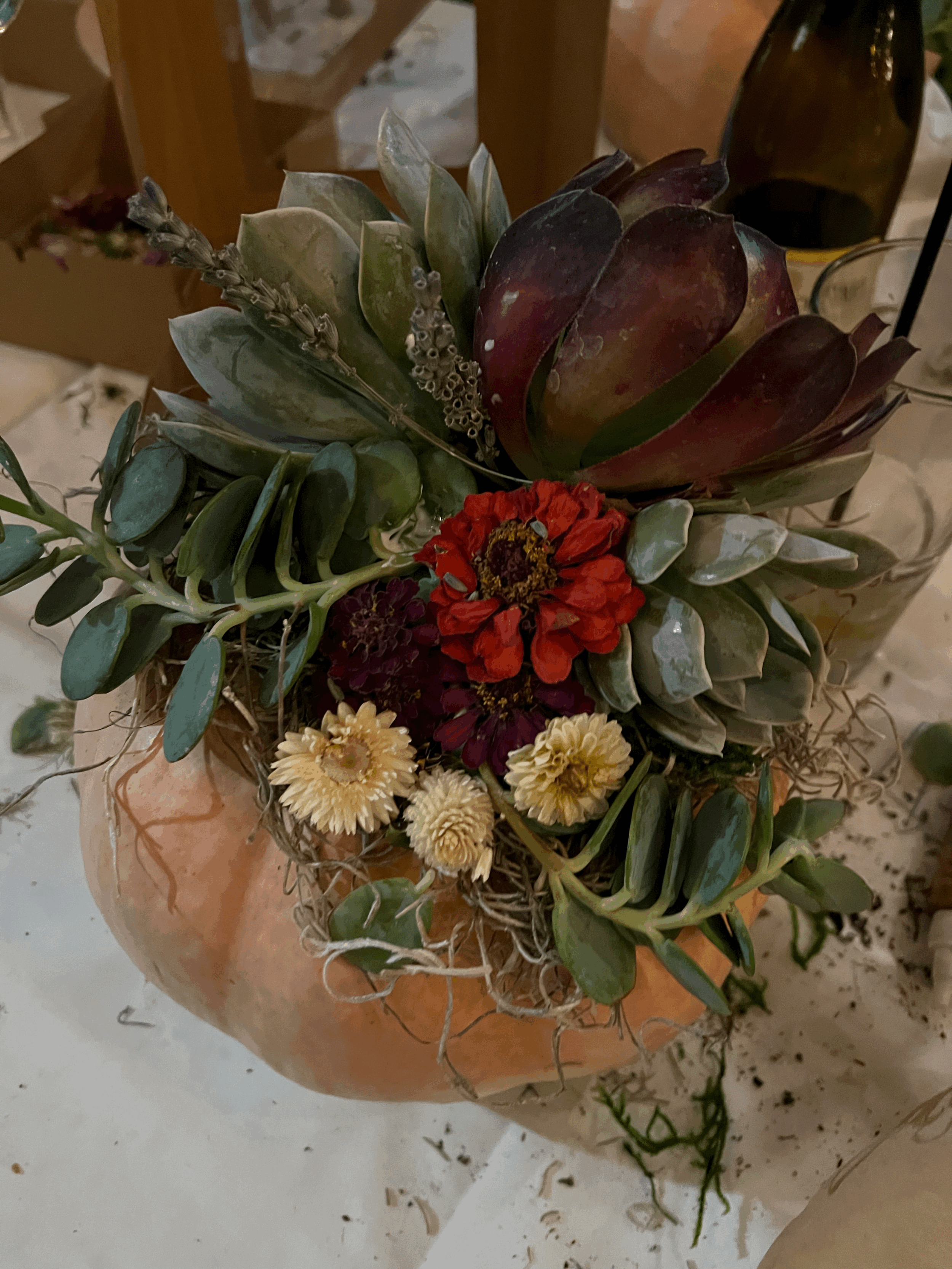 Select your favorite Sweet Thistle Farms pumpkin and We’ll provide succulents, moss and fall flair. These are a great long lasting centerpiece perfect for fall. Great girls night, date night or team building time.